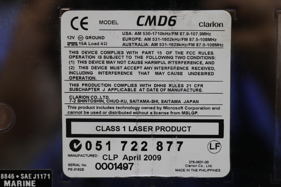RV Electronics USED CMD6 CLARION WATERTIGHT MARINE CD/USB RECEIVER FOR SALE